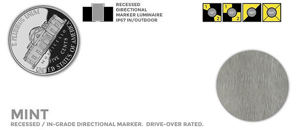 MINT IS THE WORLD’S SMALLEST BI- AND UNI-DIRECTIONAL DRIVE-OVER-RATED RECESSED / IN-GRADE MARKER LUMINAIRE. WITH FIXTURE DIMENSIONS OF AN AMERICAN NICKEL. PATENT PENDING. AVAILABLE IN 45º AND 90º UNI- AND BI-DIRECTIONAL, AND IN 180º AND 360º. NOTE: 180º AND 360º ARE. NOT DRIVE-OVER RATED.